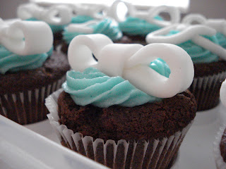 For the little Tiffany bows I went and got some white ready-to-use fondant and rolled out a couple of strips in about an inch in thickness. For the loops, take the two ends and bring the the center of the strip to form the bow. A dab of water helps to keep it together. Take another little piece of fondant and wrap around the center of the two loops to form the center of the bow. I used piece of paper towels to place into the loops so that they won't fall while drying. And voila! A fun little treat for all to enjoy! (just as long as you like chocolate...and awesome things)